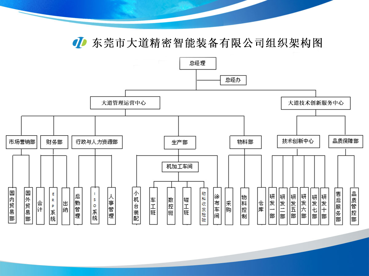 大道精密成立于2019年,公司注冊資本1000萬元,擁有辦公室、廠房等18,000多平方米。已通過ISO9001:2015國際質(zhì)量管理體系認證,擁有國家各類專利共計58項,獲得“中國大道.商標”和“一帶一路十周年 .國禮品牌”等榮譽稱號,屬于國家高新技術(shù)企業(yè),專精特新中小企業(yè)。2023年4月成立了“東莞市大道精密智能裝備有限公司關(guān)心下一代工作委員會”,是東莞市企石鎮(zhèn)工商聯(lián)副會長單位、東莞市企石鎮(zhèn)文學藝術(shù)界聯(lián)合會副主席單位、東莞市環(huán)保包裝行業(yè)協(xié)會副會長單位、東莞市數(shù)控裝備行業(yè)協(xié)會第二屆會長單位、廣東省包裝技術(shù)協(xié)會常務(wù)理事單位、廣東省膠粘劑行業(yè)協(xié)會理事單位、國家標準《機械安全中安全防護授權(quán)系統(tǒng)的基本要求》起草單位。